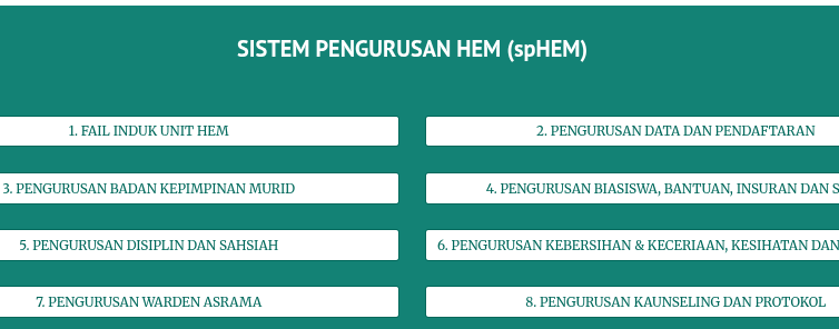 spHEM atau Sistem Pengurusan Hal Ehwal Murid ialah satu platform digital yang direka khusus untuk membantu pihak sekolah dalam mengurus, menyelaras, dan memantau semua aspek berkaitan Hal Ehwal Murid secara sistematik, tersusun dan berpusat.